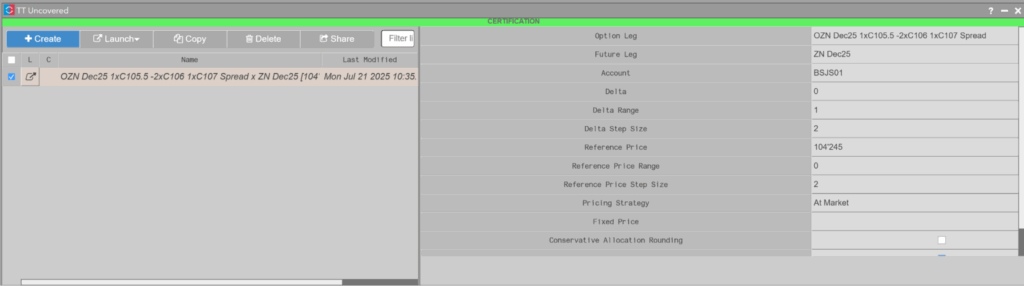 - The functionality previously available in the TT Uncovered .NET SDK is now an embedded application in the TT front end (aka TTW and TT Desktop), including the ability to create and execute CME Covered UDS instruments and automatically unwind allocated futures, as well as workflow integrations with existing TTW widgets.