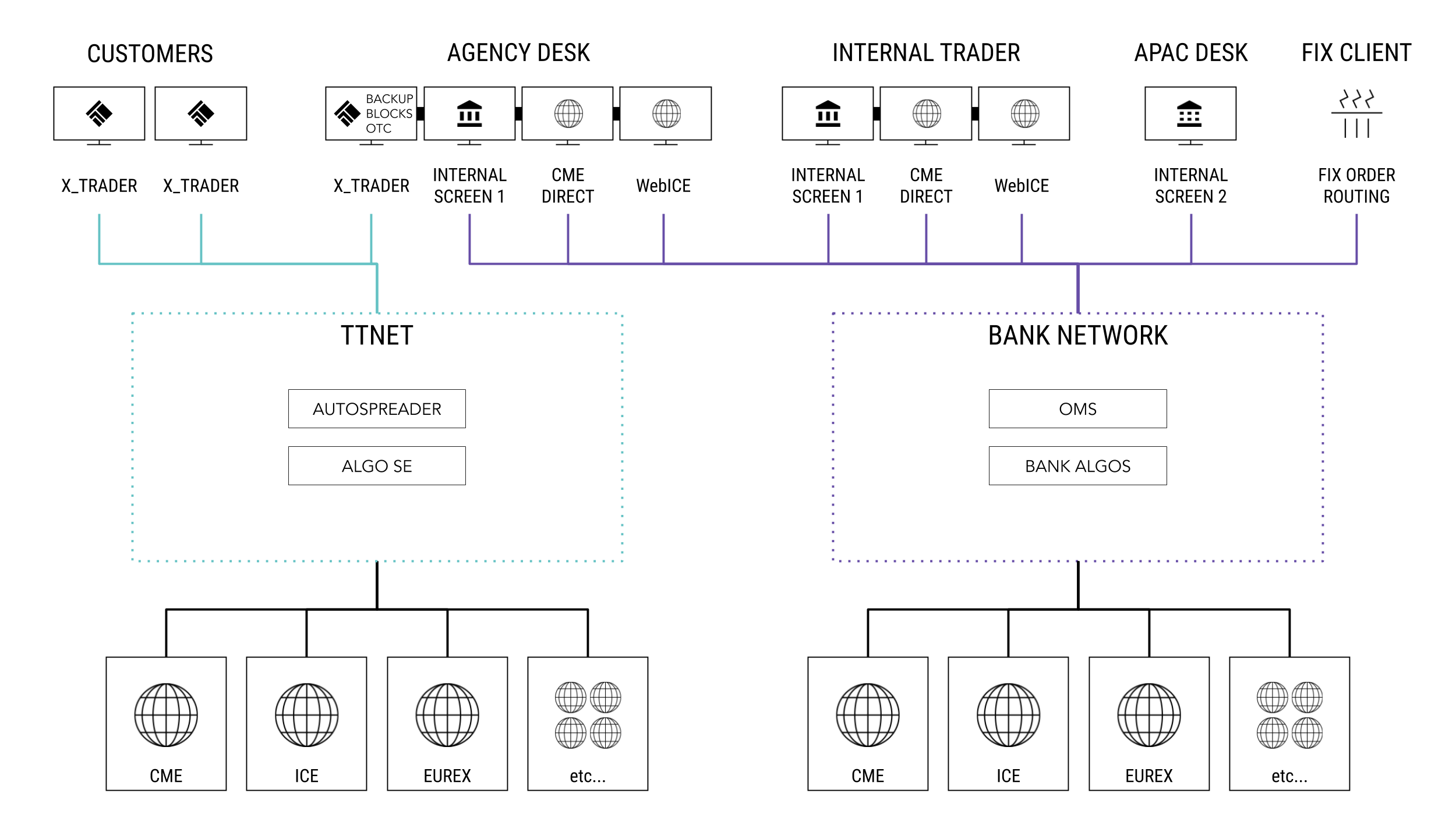 One of our existing TTNET™ customers is a leading bank with operations around the world. They had over 250 X_TRADER® licenses for internal and external users plus three internal platforms totaling over 500 users. The internal platforms had reached end-of-life and would have required significant investment to continue using. However, the bank had recently built out native market access to the primary exchanges and wanted to continue leveraging that access along with their proprietary execution algo platform. As the bank migrated to the TT platform, they wanted to upgrade or replace their internal platforms and consolidate onto a single platform, all while continuing to utilize their own market access and execution algos.