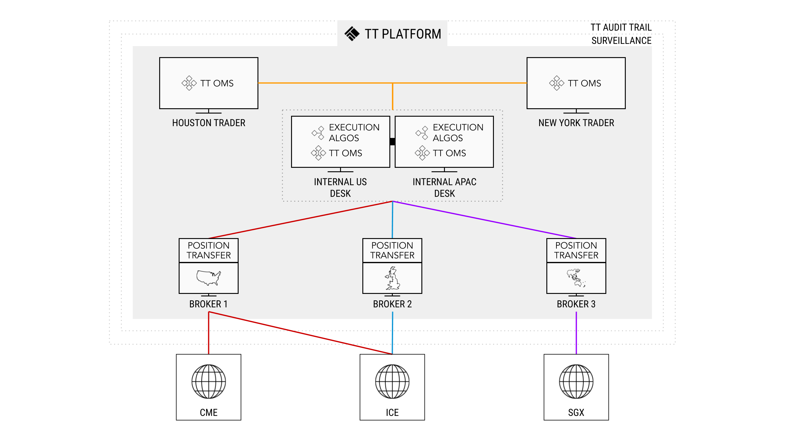 One of our customers is a leading global commodities trading firm with nearly 100 traders in multiple offices around the world. In addition to Trading Technologies, they used Fidessa, CQG, WebICE and LMESelect, and they have four FCM relationships to trade primarily crude and metals products on CME, ICE, LME, SGX, TOCOM and other derivatives exchanges. This trading firm had two primary goals. First, they wanted to reduce the complexity and cost of their IT infrastructure by consolidating trading platforms. Second, they wanted to improve the quality of their executions by centralizing order flow through execution desks, allowing execution specialists to fulfill orders, while at the same time minimizing execution fees.