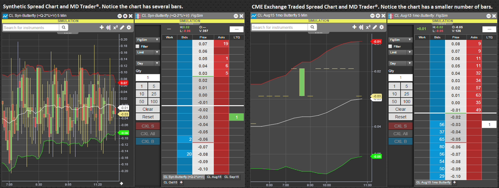 Synthetic spread charts (L) will have more data and provide more information about how a spread moves compared to exchange traded spread charts (R). |