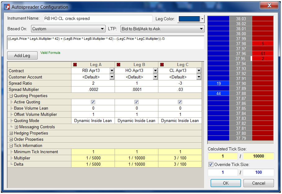 Based on user-defined parameters and the outright market prices for the spread legs, Autospreader calculates and displays a spread market where traders can submit spread orders at the desired spread price.